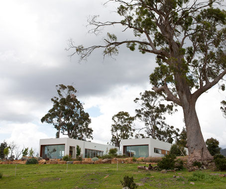The Courtyard House is a contemporary family home on a semi-rural property in Dilston, Tasmania, designed by architecture firm Circa Morris-Nunn Walker. The clients wished for a space for their growing family, along with shared living areas, and spaces for working, relaxing and playing. The site’s ideal location with panoramic views of rolling green hills and the Tamar River, meant the framing of these views became central to the design and orientation. The layout consists of a cluster of built forms with external courtyards, used to separate different rooms and delineate the children's spaces from the adults. The position of the rooms allows for maximum northern sun exposure, while the choice of concrete as a high thermal mass material, allows for the passive heating of the house.