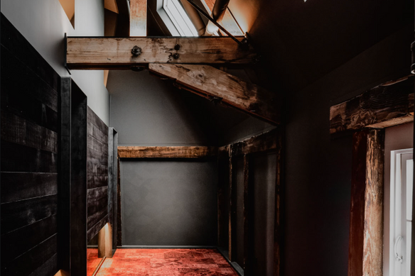 This flour mill has remarkably survived extreme conditions, with a major structural fire and two centuries of climatic weather conditions. These elements are reflected in history held within the building, as the black interior is a representative of the burnt timber framing and the Inclusion of the old, surviving large trusses and sandstone are complemented in the design with the luxurious rich, red patterned carpet that adds to the buildings age and expensiveness of the accommodation.